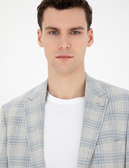 - AçıK MAVI SLIM FIT KETEN KARışıMLı EKOSE CEKET